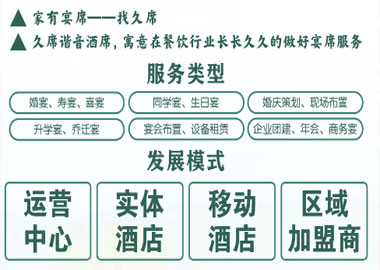 重庆久席餐饮管理有限公司是一家专注于移动酒店的公司,致力于为消费者提供品质,方便快捷的酒店餐饮服务。